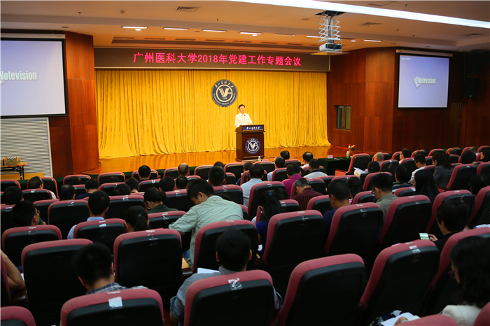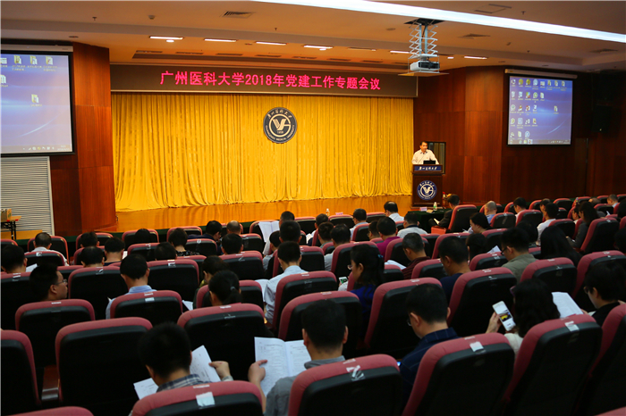 广医在线讯 4月19日上午,学校在番禺校区学术报告厅召开2018年党建工作专题会议。学校党委书记冉丕鑫、副书记陈晓辉,学校党务职能部门负责人,各直属医院党委书记、副书记、党办主任,校本部党总支书记、副书记、党支部书记,全体兼职组织员参加会议。会议由党委组织部部长何朝晖主持。