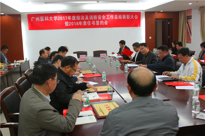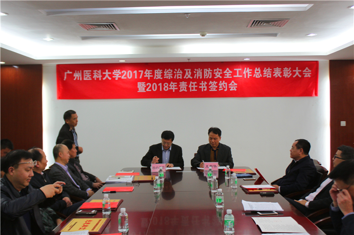1月2日下午,我校在番禺校区召开2017年维护稳定及社会治安综合治理和消防安全工作总结表彰大会暨2018年责任书签约会。校长王新华、副校长黄健清,学校各部处、各附属医院等共计35个单位的安全责任人出席了本次签约会。