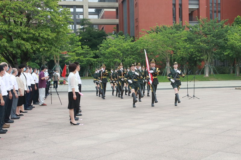 8月29日早上,我校2022年秋季学期开学升旗仪式在番禺校区广场举行。国旗护卫队同学踏着整齐的步伐,怀着赤诚的敬意,伴随着嘹亮雄壮的《义勇军进行曲》,将鲜艳的五星红旗徐徐升起。师生们齐唱国歌,行注目礼,表达对祖国的热爱和祝福。