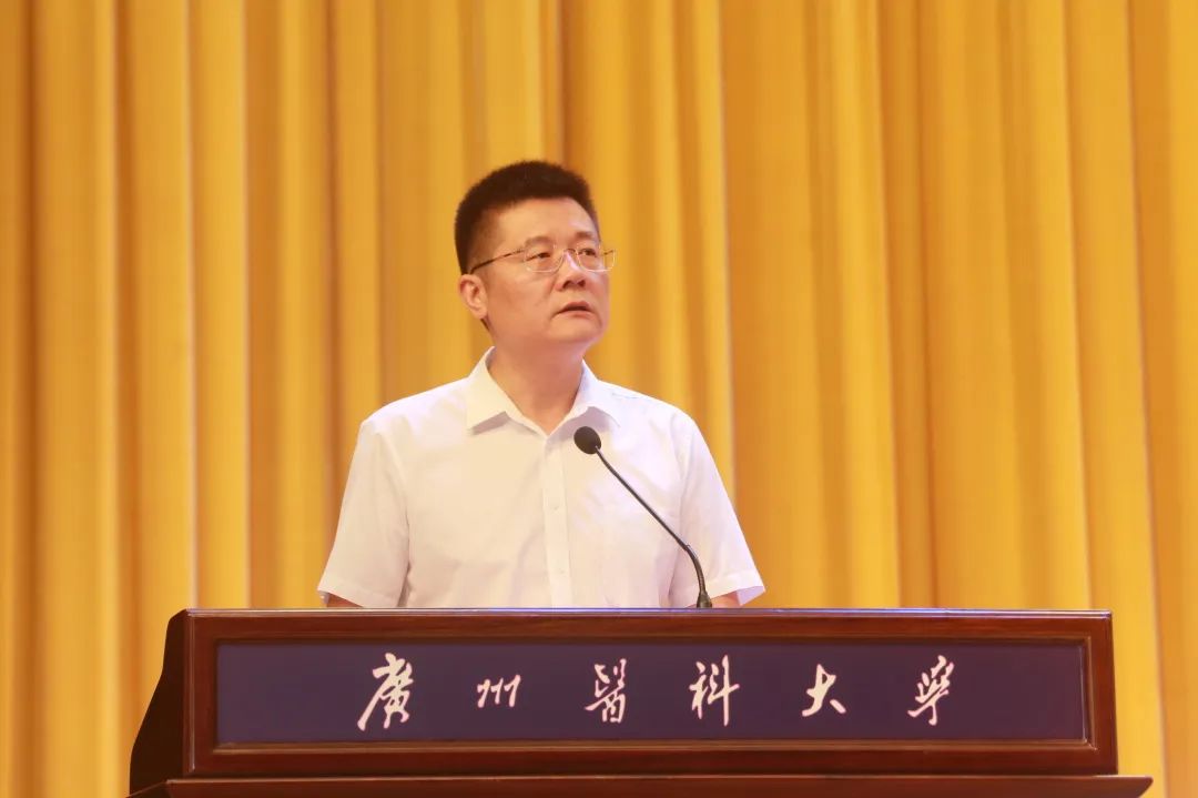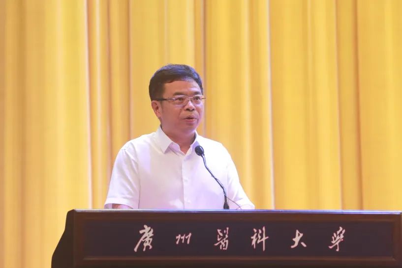 校长赵醒村代表学校祝贺新同学来到广州医科大学启航人生新征程。在讲话中,他带领新生走进广医这所“双一流”建设高校和“卓越医生教育培养计划”高校,了解催人奋进的广医故事,领略源远流长的医学教育文化。