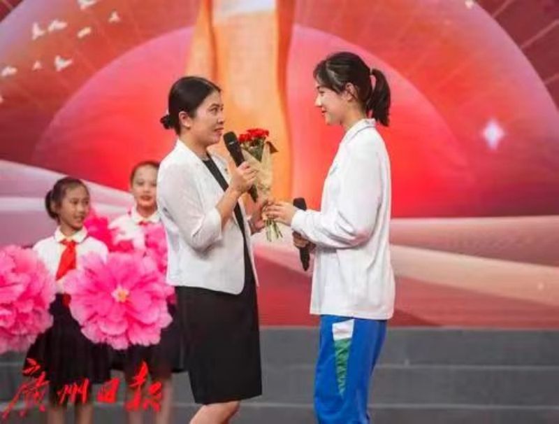 在颁奖仪式上,何泓老师的女儿为妈妈献花,并表示妈妈永远是她和弟弟的骄傲